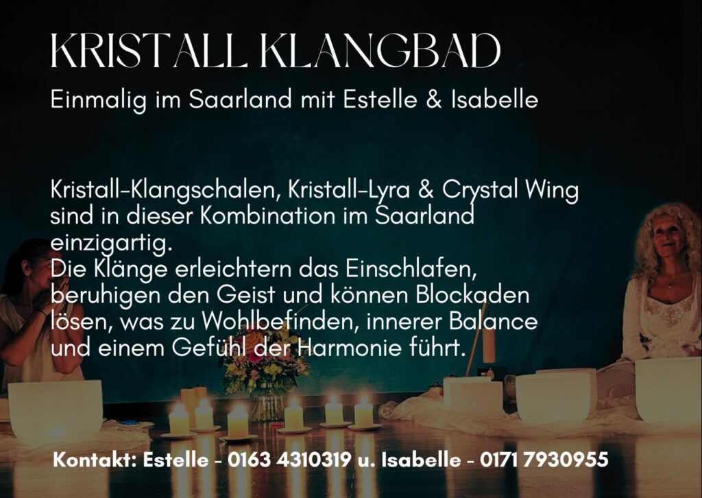 Kristall-Klangschalen, Kristall-Lyra und Crystal Wing sind in dieser Kombination einmalig im Saarland.